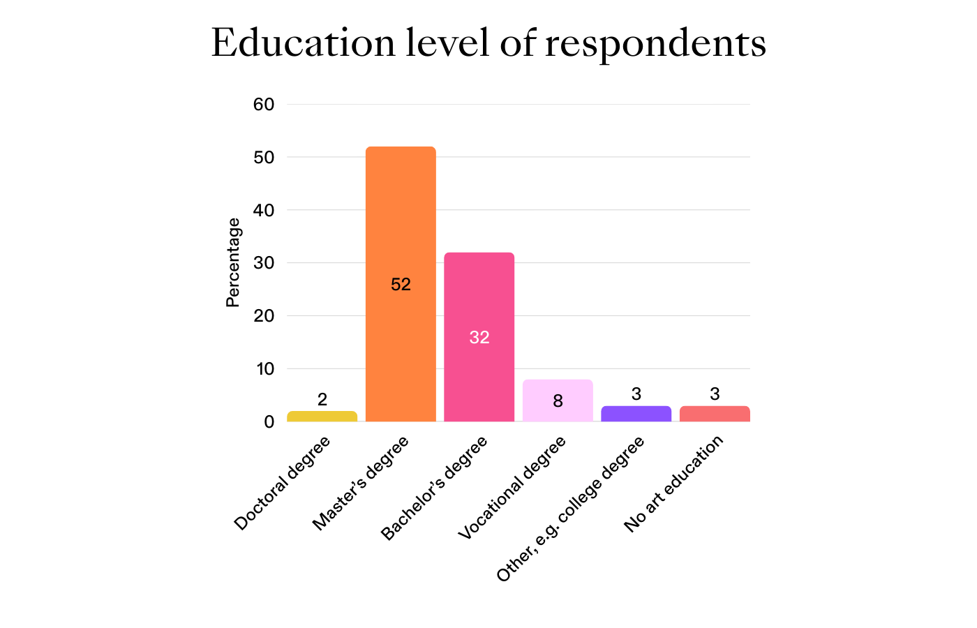 Professionals within the field of visual arts are highly educated in Finland. Of the respondents, 86% hold at least a bachelor’s degree (Bachelor or AMK) in the field of arts, of whom 52% have a master’s degree (Master or YAMK) and just under 2% a doctoral degree. 8% have a vocational degree and just under 3% have another type of qualification, such as a college degree. However, a high level of education does not directly translate to a stable income or employment opportunities for visual artists.